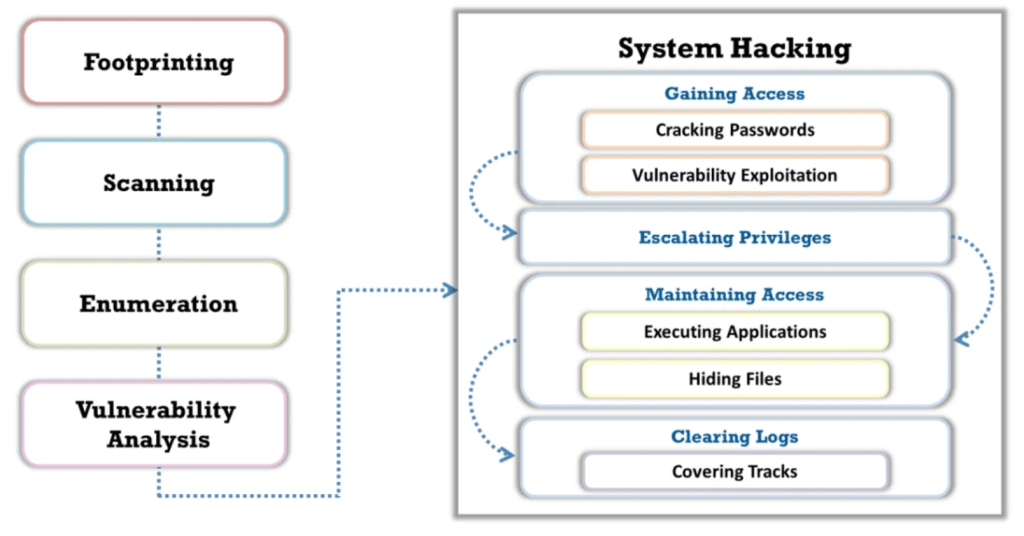Tahap selanjutnya adalah system hacking dimana hacker sudah secara aktif mengeksploitasi sistem target. Beberapa tahapan dalam melakukan system hacking ini antara lain gaining access, escalating privileges, maintaining access, dan clearing logs.