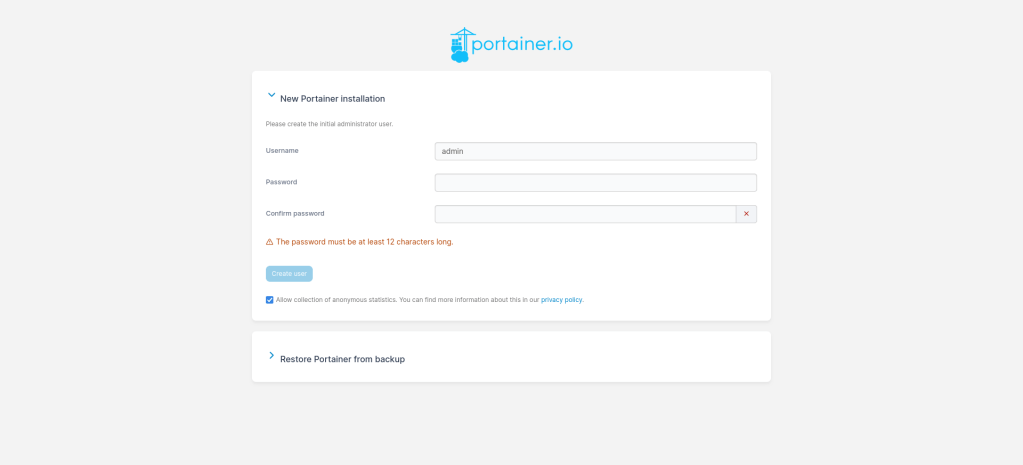 Setelah itu, Portainer bisa diakses melalui browser di http://localhost:9000, di mana kita bisa melihat daftar container, memonitor penggunaan sumber daya, serta mengelola sistem Docker tanpa perlu membuka terminal. Namun ketika pertama kali membuka portainer, kita akan diminta untuk membuat akun admin.