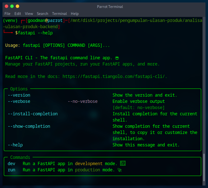 jalankan perintah fastapi --help untuk melihat penjelasan mengenai fastapi-cli.